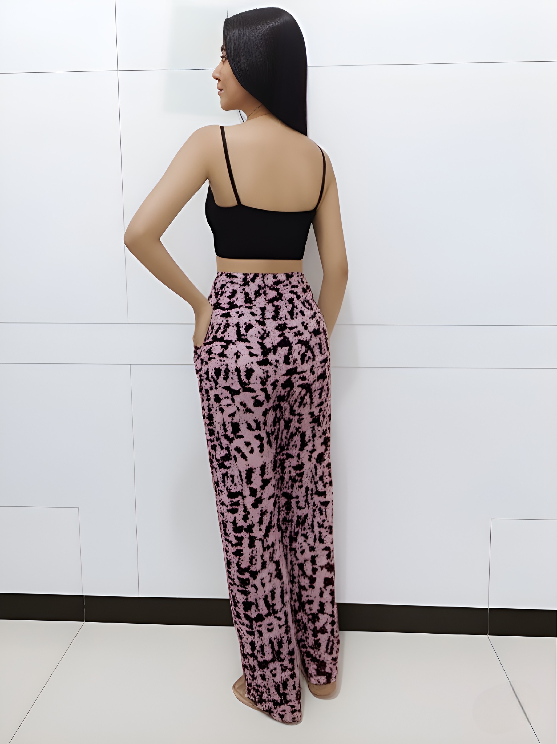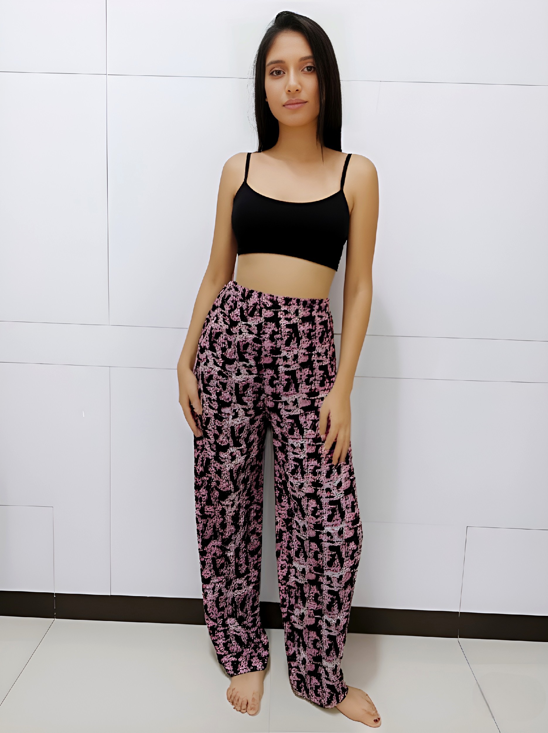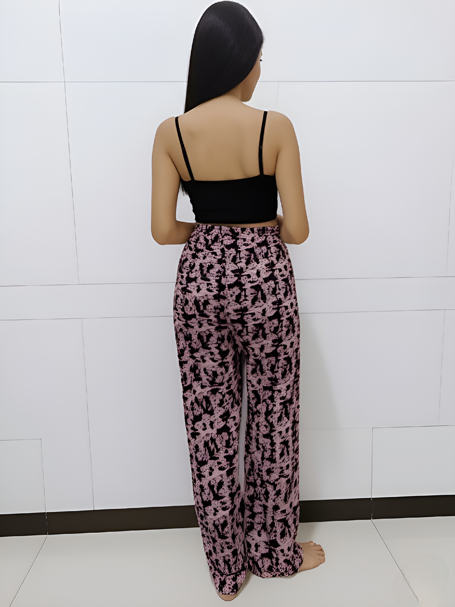 Make a bold statement with these chic black and pink wide-leg palazzo pants featuring an eye-catching abstract floral print. Crafted from lightweight, breathable fabric, these pants are designed for all-day comfort without compromising on style. The relaxed silhouette drapes effortlessly, making it a go-to piece for lounging at home, running errands, or even casual outings. With an elasticized waistband and soft texture, it ensures a flattering yet comfortable fit. Product Details: Color: Black base with pink and white abstract floral print Fit: Relaxed wide-leg fit Waistband: Fully elastic for flexibility and ease Length: Full length Fabric: Soft and breathable rayon blend Care Instructions: Machine wash cold, gentle cycle; do not bleach; line dry Size Options: Available in S, M, L, XL (Refer to the size chart for exact measurements) Style Tip: Pair it with a solid crop top or tank, minimal accessories, and sandals or sneakers for an effortlessly stylish look.